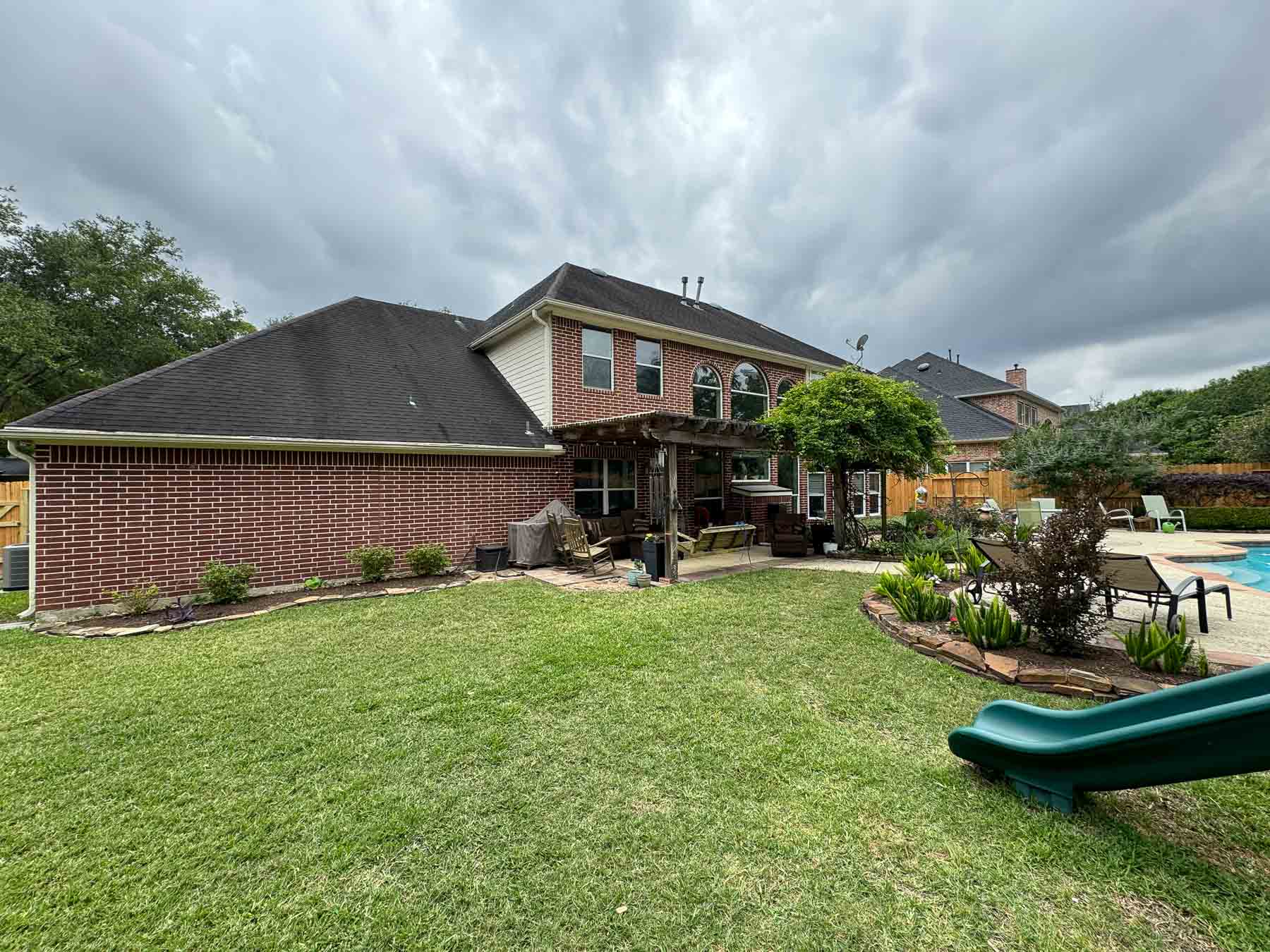 To complete this backyard design, we added a charming attached pergola with a comfortable seating area. It’s the perfect spot to sit back, unwind, and soak up the outdoors in style.