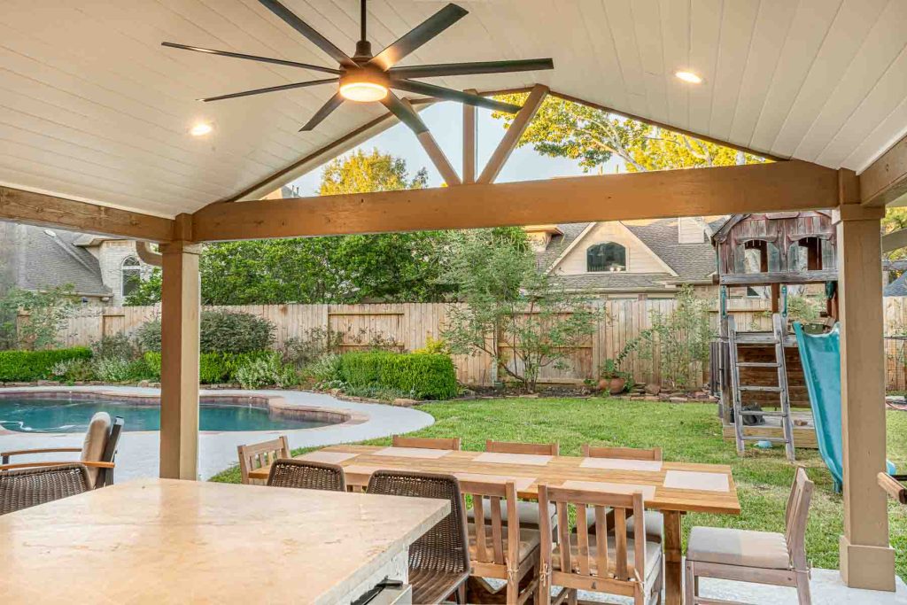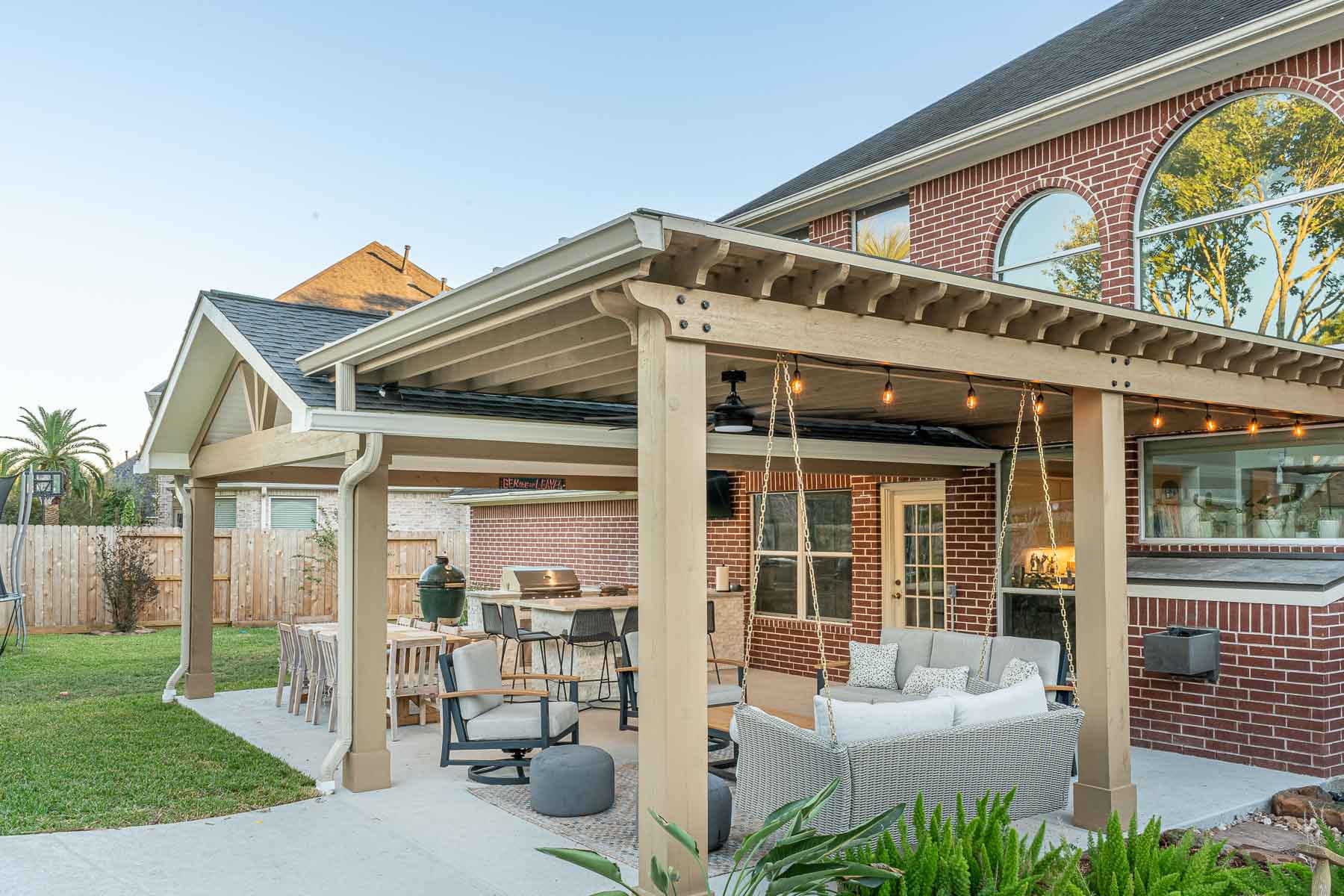 To add even more comfort and ambiance, this patio cover is complete with outdoor lighting and ceiling fans, making it easy to enjoy your backyard from sunny afternoons to cozy evenings.