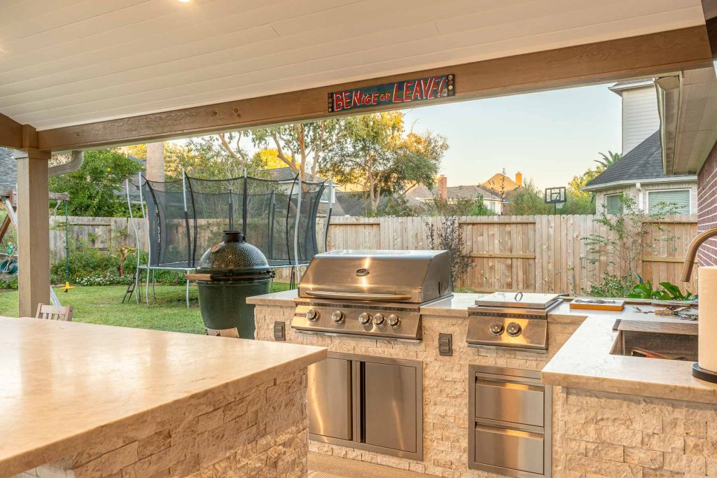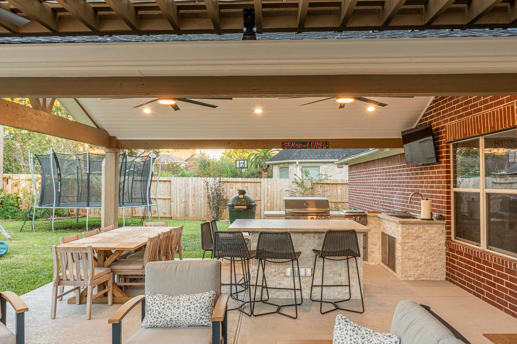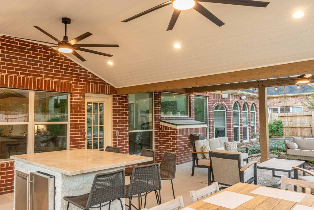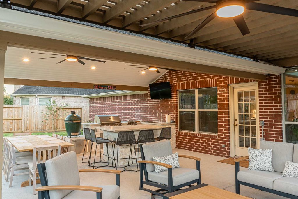 Additional Features: Outdoor kitchen with island for extra seating, recessed lighting, ceiling fans.
