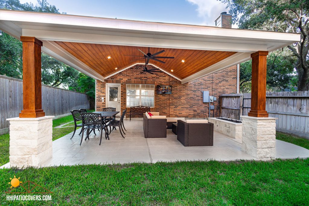 From a plain and uninspired yard to a new picture-perfect extension of the house, this hip-style patio cover has completely transformed our client’s backyard into a space full of character and charm. What was once an empty, unused space is now the perfect setting for family dinners, weekend barbecues, or gathering around the fire pit on chilly evenings. This custom design features partial height limestone columns that add a touch of elegance and natural beauty, while the LED lighting brightens up the nights and ceiling fans keep things cool during those hot summer days. The stamped concrete flooring brings a durable yet stylish foundation, perfect for everyday use or entertaining guests.