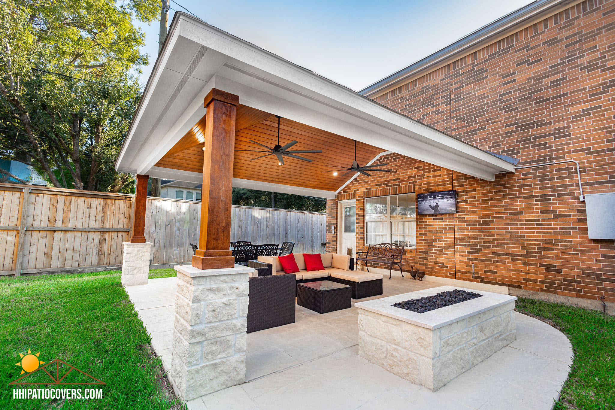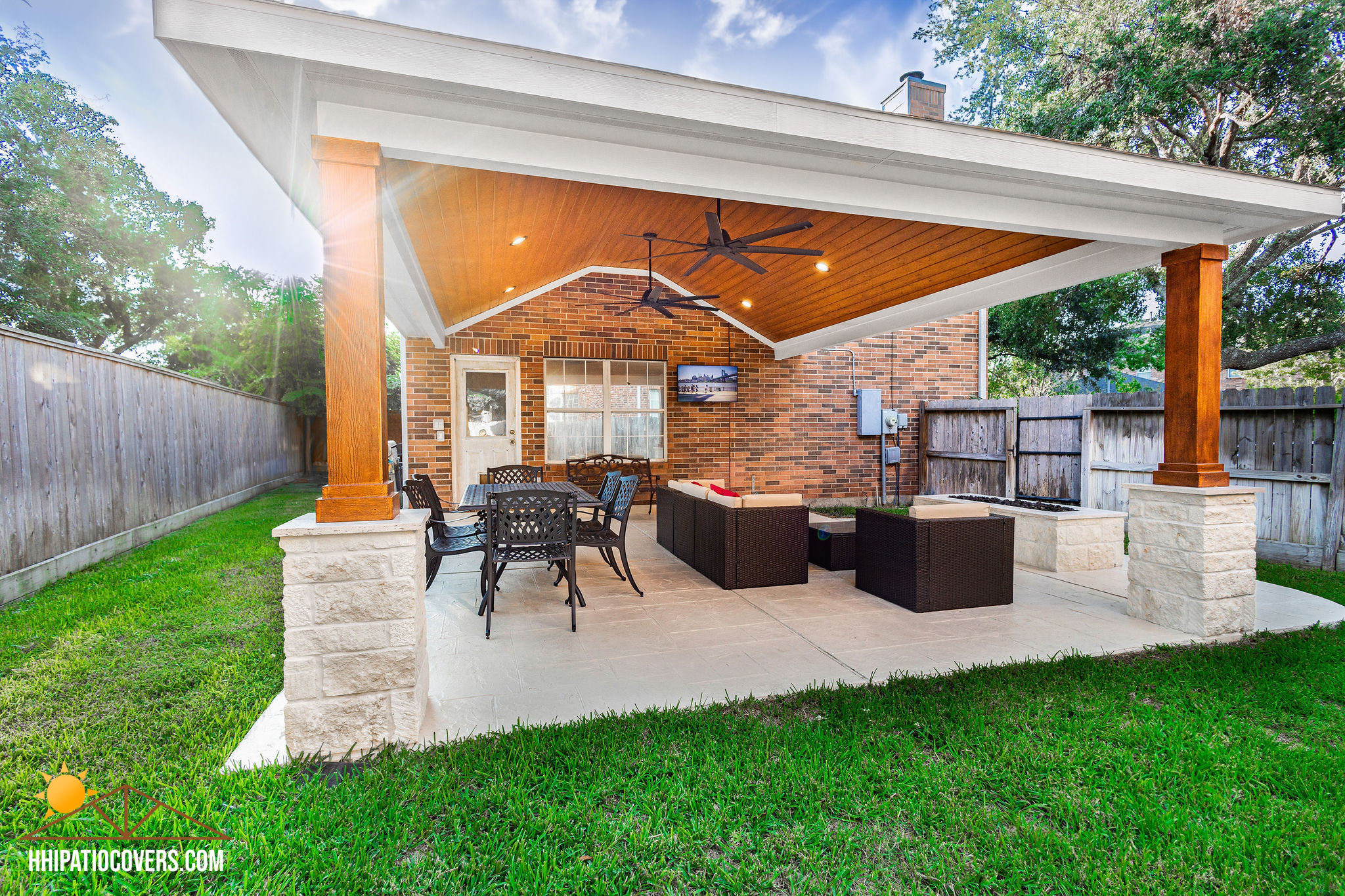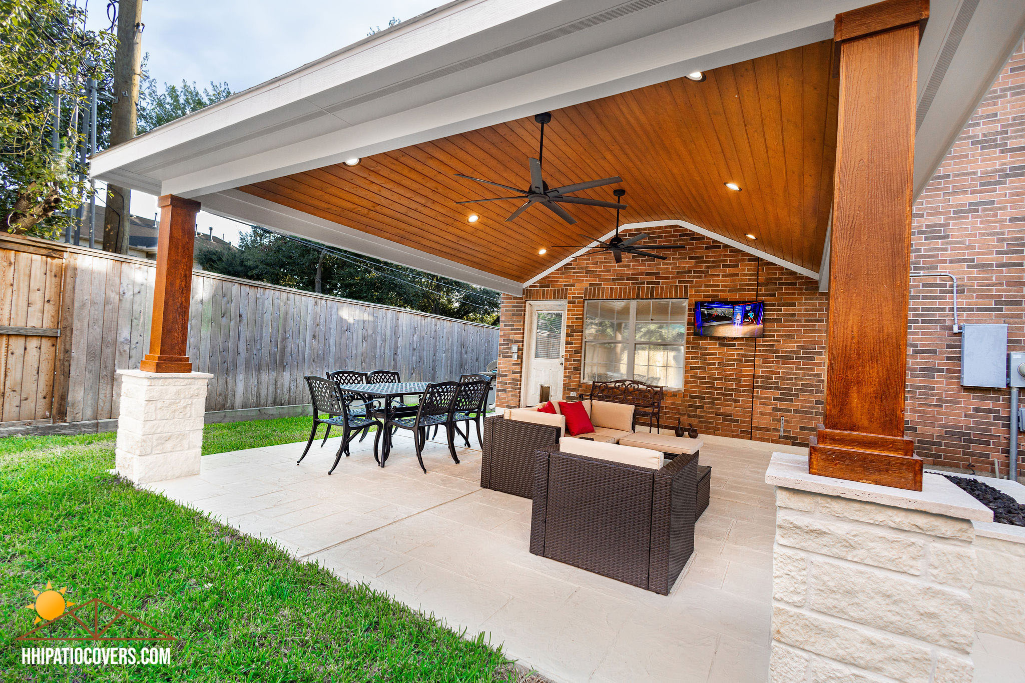 From a plain and uninspired yard to a new picture-perfect extension of the house, this hip-style patio cover has completely transformed our client’s backyard into a space full of character and charm. What was once an empty, unused space is now the perfect setting for family dinners, weekend barbecues, or gathering around the fire pit on chilly evenings. This custom design features partial height limestone columns that add a touch of elegance and natural beauty, while the LED lighting brightens up the nights and ceiling fans keep things cool during those hot summer days. The stamped concrete flooring brings a durable yet stylish foundation, perfect for everyday use or entertaining guests.